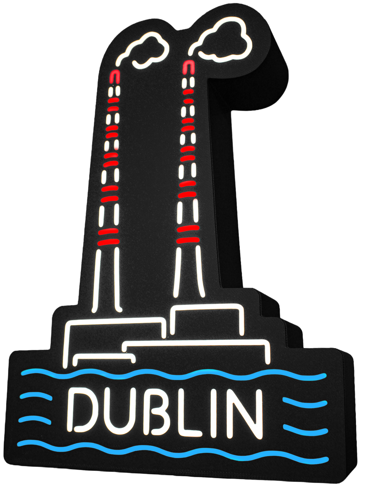 A custom-designed LED light inspired by Dublin’s iconic Poolbeg chimneys. This piece combines bold graphic styling with a warm neon-style glow, featuring the famous twin stacks, clouds above, and flowing water lines framing the DUBLIN lettering below. The layered construction gives it a strong sculptural presence by day, while the illuminated lines bring it to life at night.